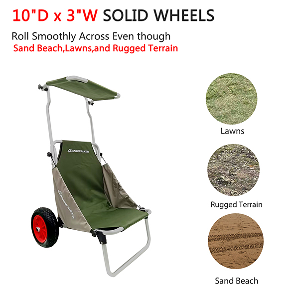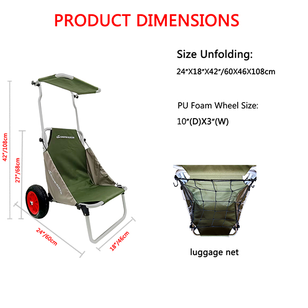 軽量で便利:重さはわずか6.4kgのビーチカートは非常に軽量で、持ち運びや輸送が簡単です。使用しないときは数秒以内に小さなサイズに折りたためるので、車のトランクに簡単に収納できます。