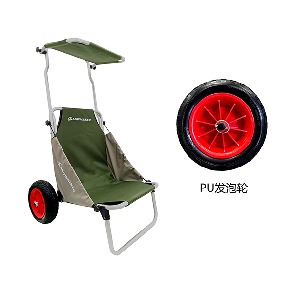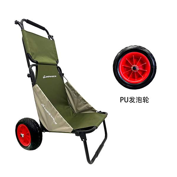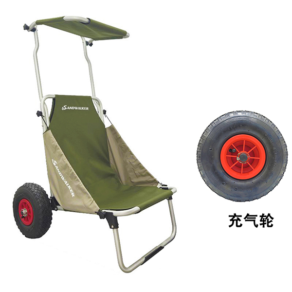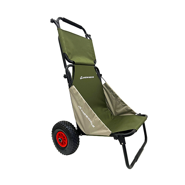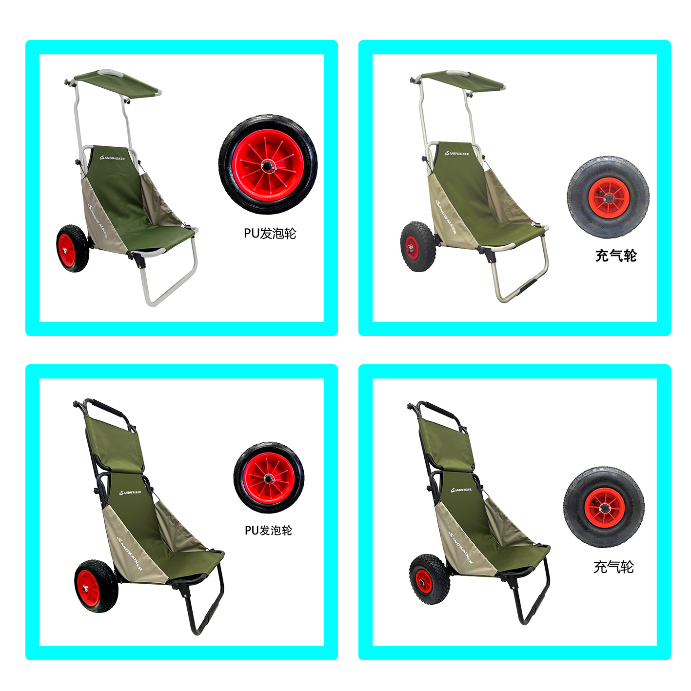 全地形対応タイヤ:砂地や緩い砂利面に取り組むように設計されたビーチカートには全地形対応タイヤが装備されています。これらのタイヤは砂にはまりにくいように特別に構造されており、スムーズな操作性と楽な移動を実現します。